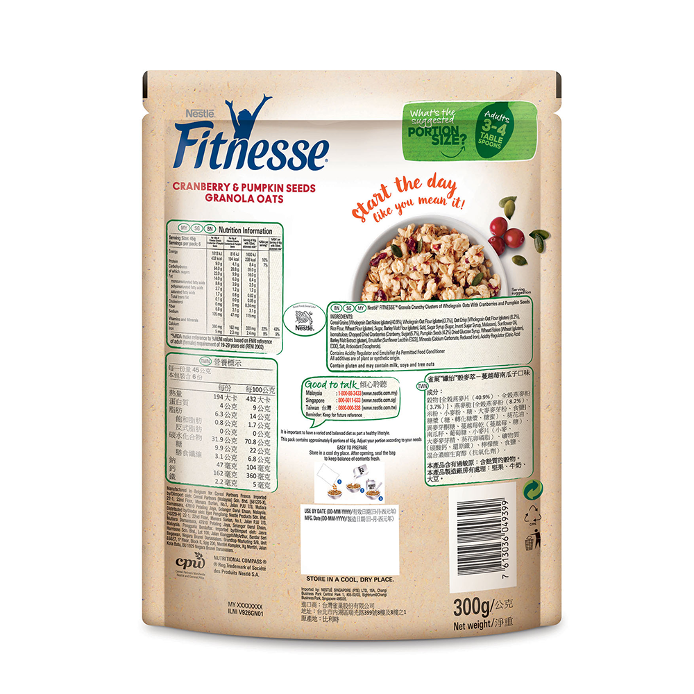 Nestle FITNESSE Granola Oats Cranberry Pumpkin Seed 300g x2 packsPrice. Quaker Original 3 in 1 Oat Cereal Drink 420g RM 1260.